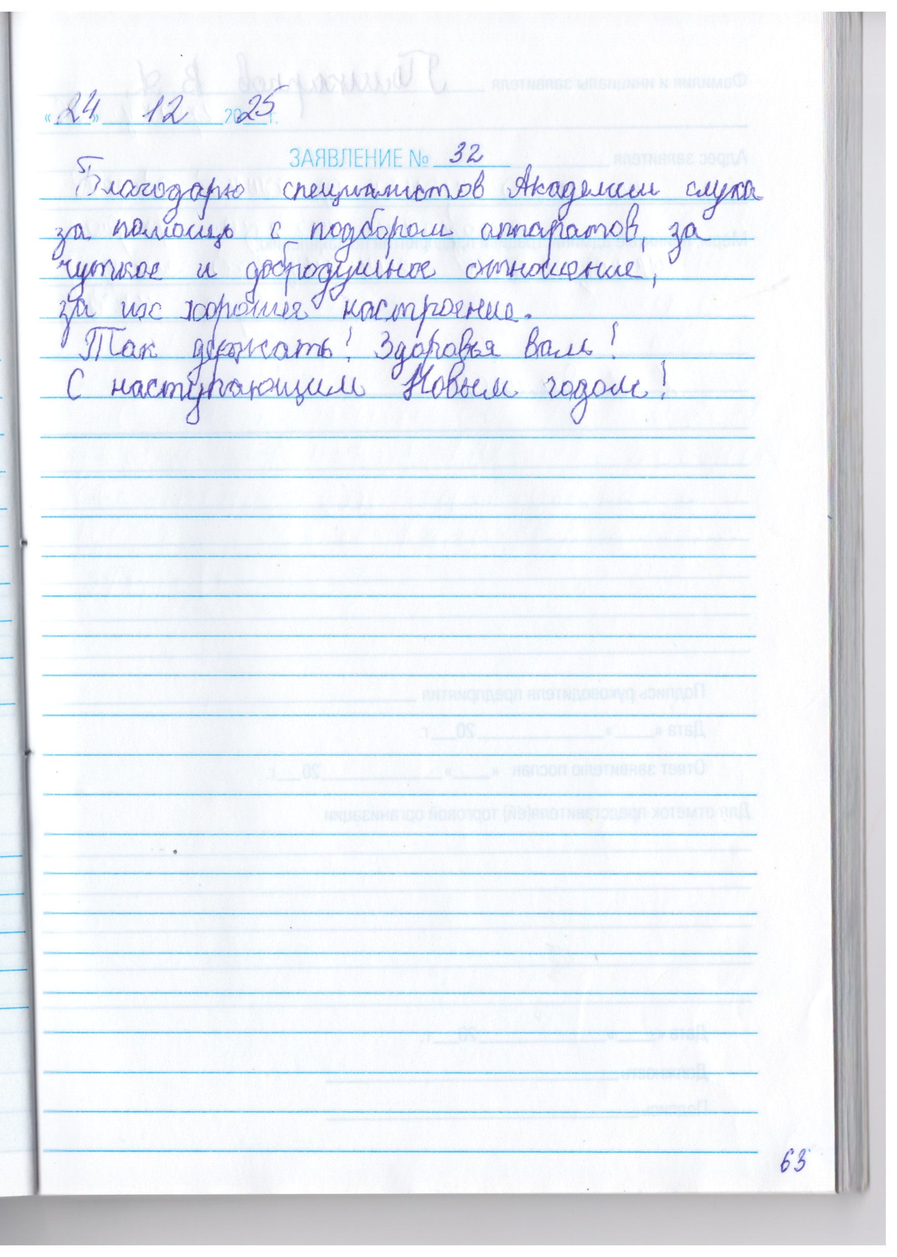 Благодарю специалистов Академии слуха за помощь с подбором аппаратов, за чуткое и добродушное отношение, за их хорошее настроение.