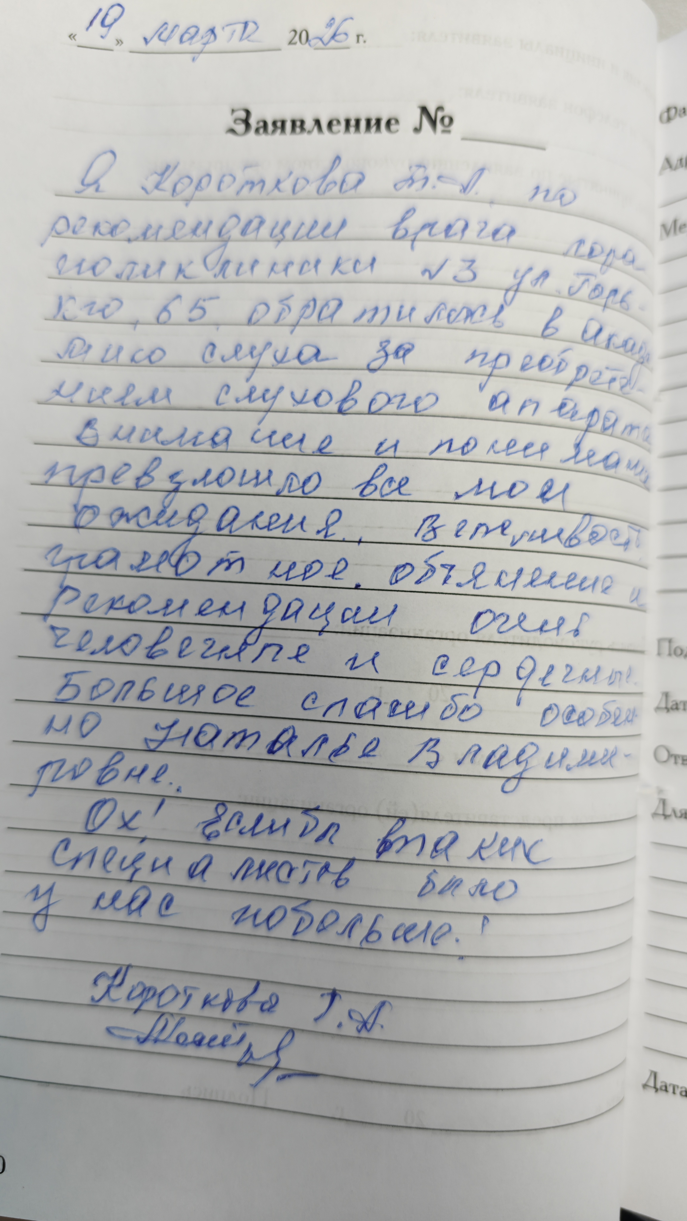 Я, Короткова Т.А. по рекомендации врача лора поликлиники № 3 ул. Горького, 65 обратилась в Академию слуха за приобретением слухового аппарата. Внимание и понимание превзошло все мои ожидания. Вежливость. Грамотное объяснения и рекомендации, очень человечные и сердечные. Большое спасибо особенно Наталье Владимировне. Ох! Если бы вот таких специалистов было у нас побольше!