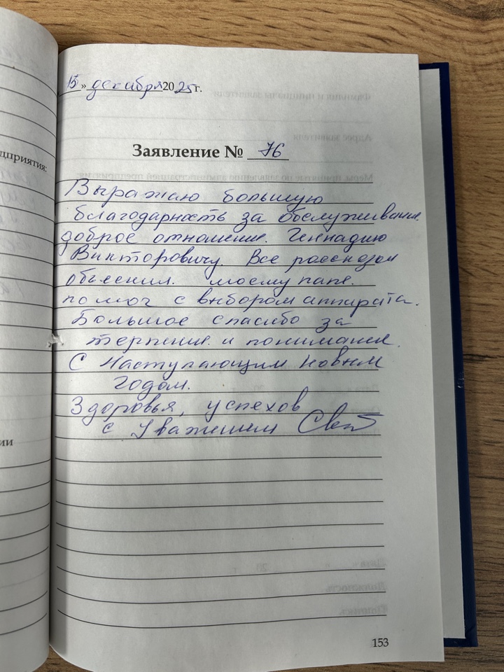 15.12.25. Выражаю большую благодарность за обслуживание доброе отношение. Геннадию Викторовичу. Всё рассказал объяснил, моему папе. Помог с выбором аппарата. Большое спасибо за терпение и понимание. С Наступающим Новым годом. Здоровья, успехов. С Уважением. Свечников Геннадий Всеволодович