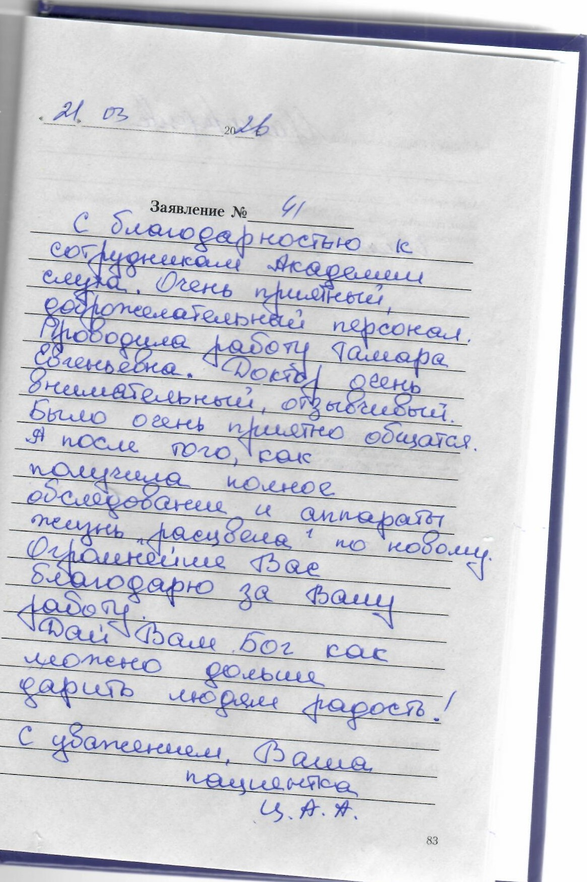 С благодарностью к сотрудникам Академии слуха.Очень приятный,доброжелательный персонал.Проводила работу Тамара Евгеньевна.Доктор очень внимательный,отзывчивый.Было очень приятно общаться.Я после того,как получила полное обследование и аппараты,жизнь расцвела по-новому. Огромнейше Вас благодарю за Вашу работу.Дай Вам Бог как можно дольше дарить людям радость! Суважением,Ваша пациентка ЦАА