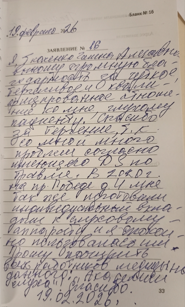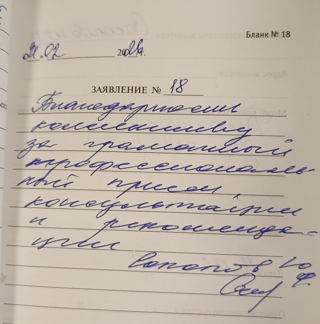 Благодарность коллективу за грамотный профессиональный прием, консультации и рекомендации.