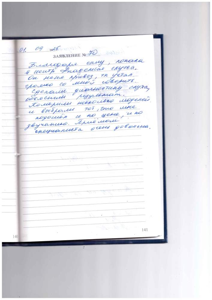 Хочу поблагодарить сотрудников центра Академия слуха за внимательное отношение к людям с плохим слухом. После приема и подбора слухового аппарата я получила подробную консультацию по уходу за аппаратом, как быстро привыкнуть, как им пользоваться. Для пожилых людей это очень сложно и важно .Еще раз спасибо и всего вам доброго!