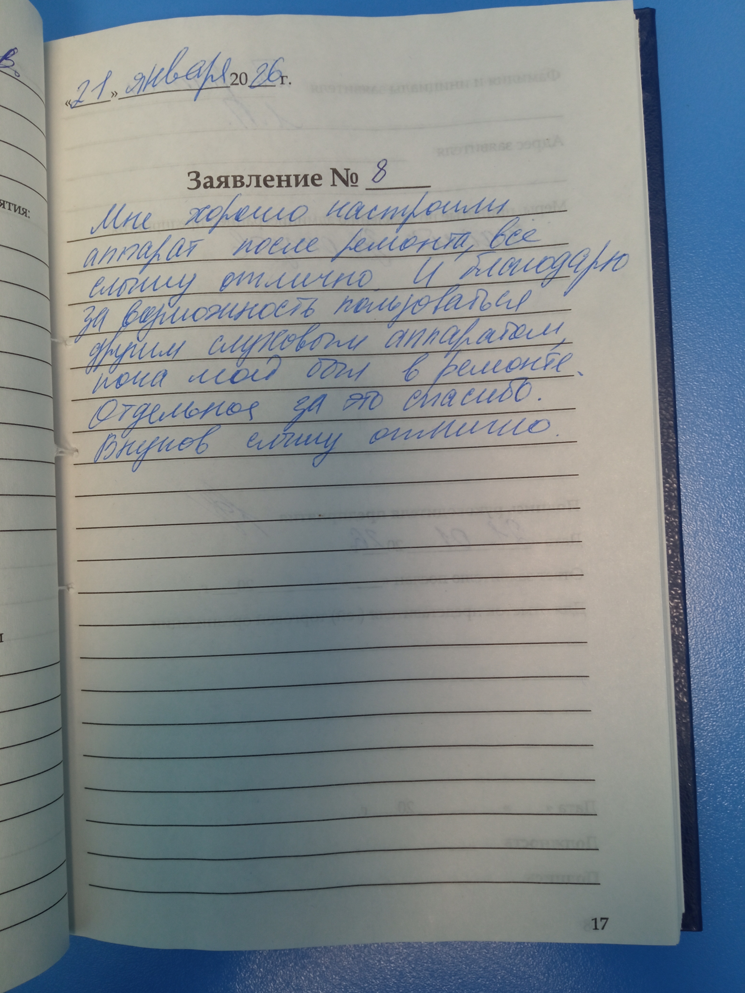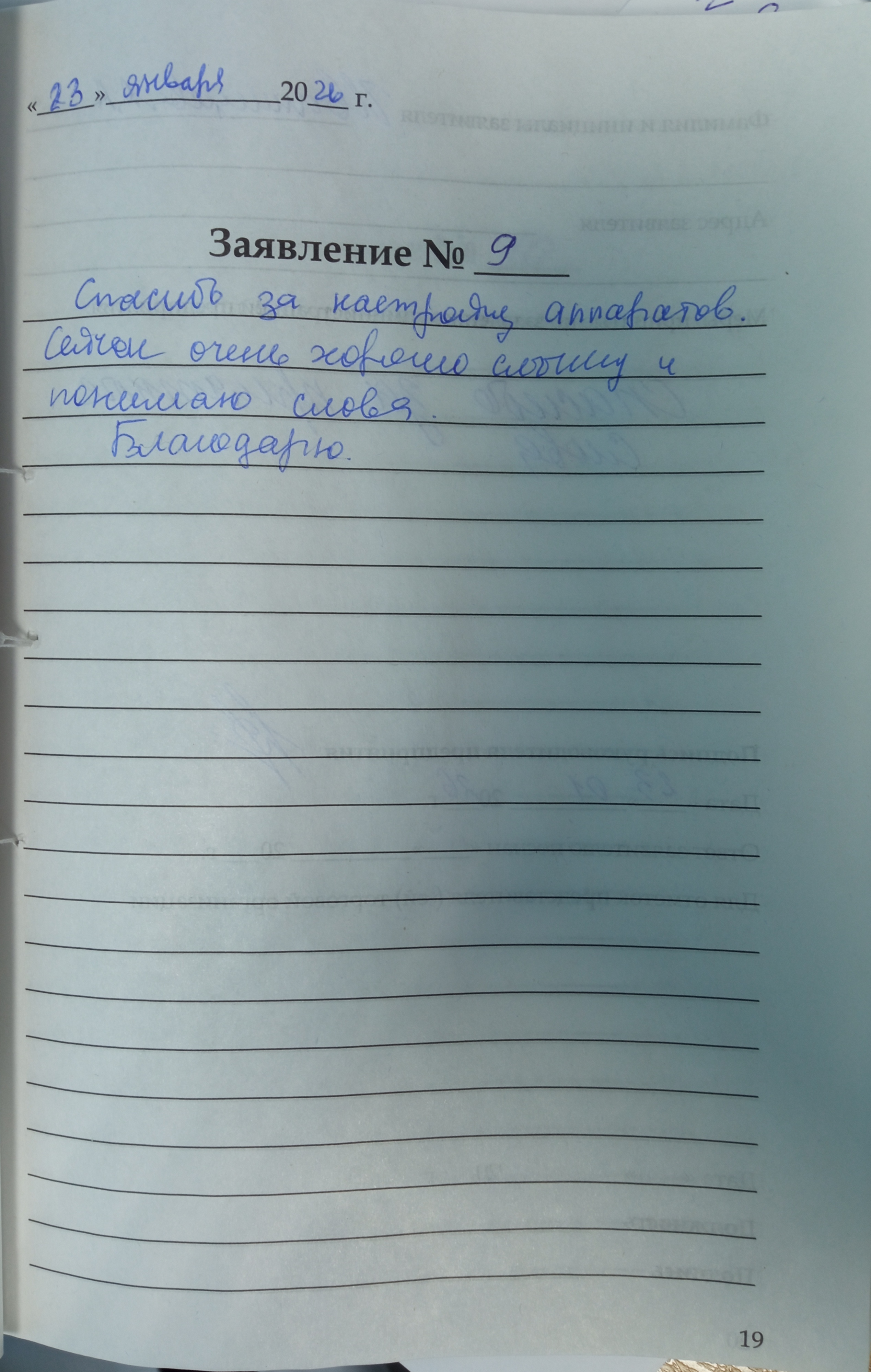 Спасибо за настройку аппаратов. Сейчас очень хорошо слышу и понимаю слова. Благодарю.