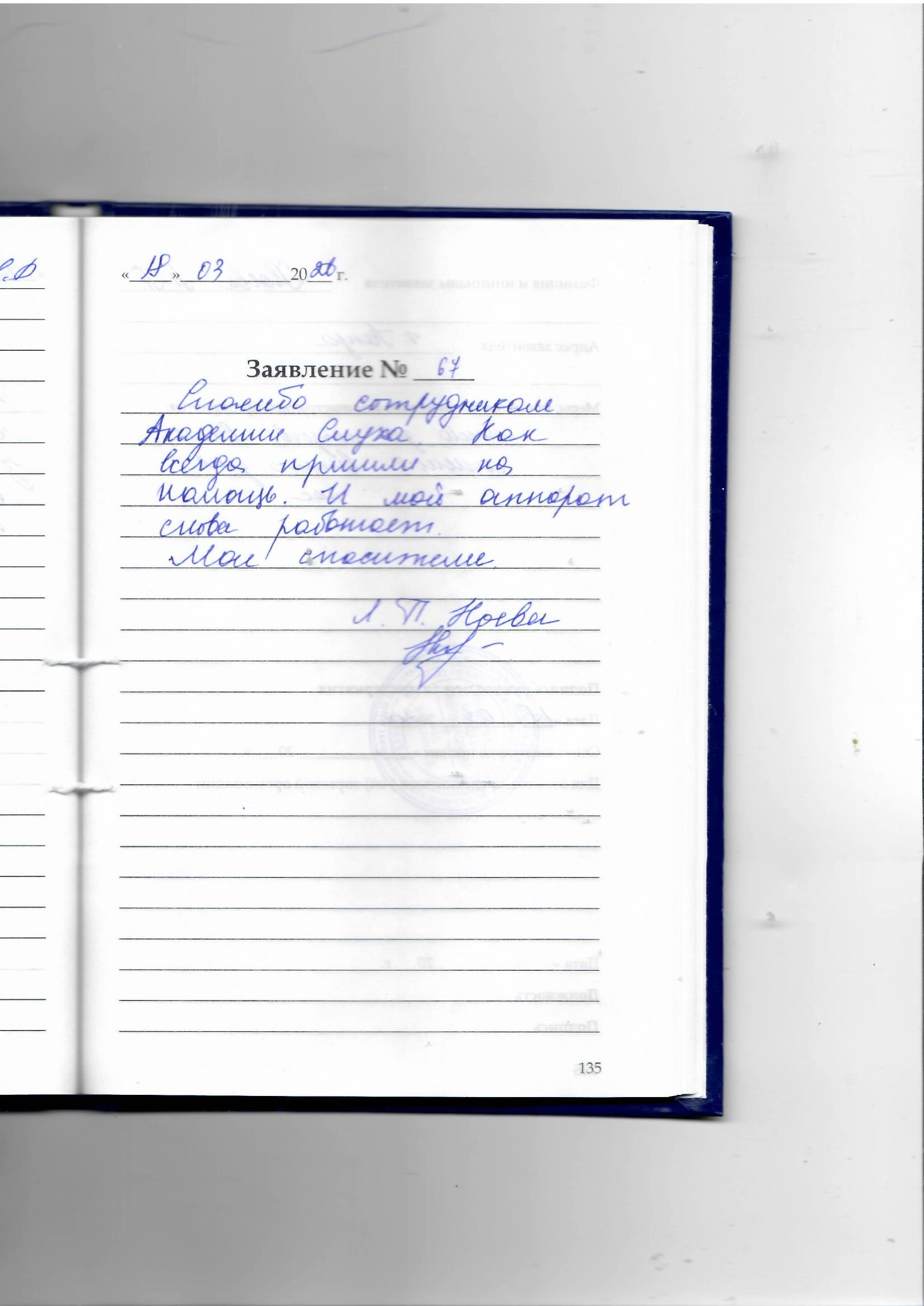 Спасибо сотрудникам Академии Слуха. Как всегда пришли на помощь и мой аппарат снова работает. Мои спасители.