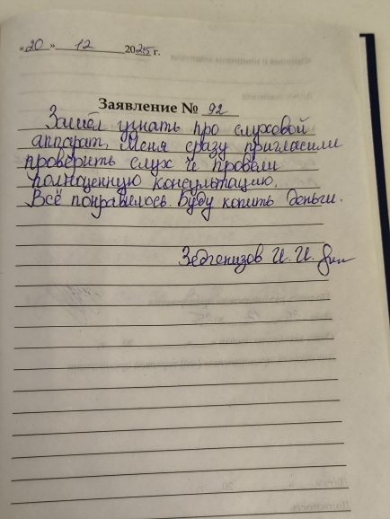 Пришла проверить аппарат, думала не работает. Сделали настройку слухового аппарата и все заработало. Спасибо сотрудникам центра за помощь. С наступающим вас!!!