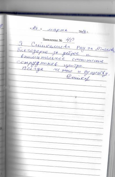 Я, Ситкалиева Рауза Атюловна, благодарю за доброе и внимательное отношение сотрудников центра. Всегда четко и по существу