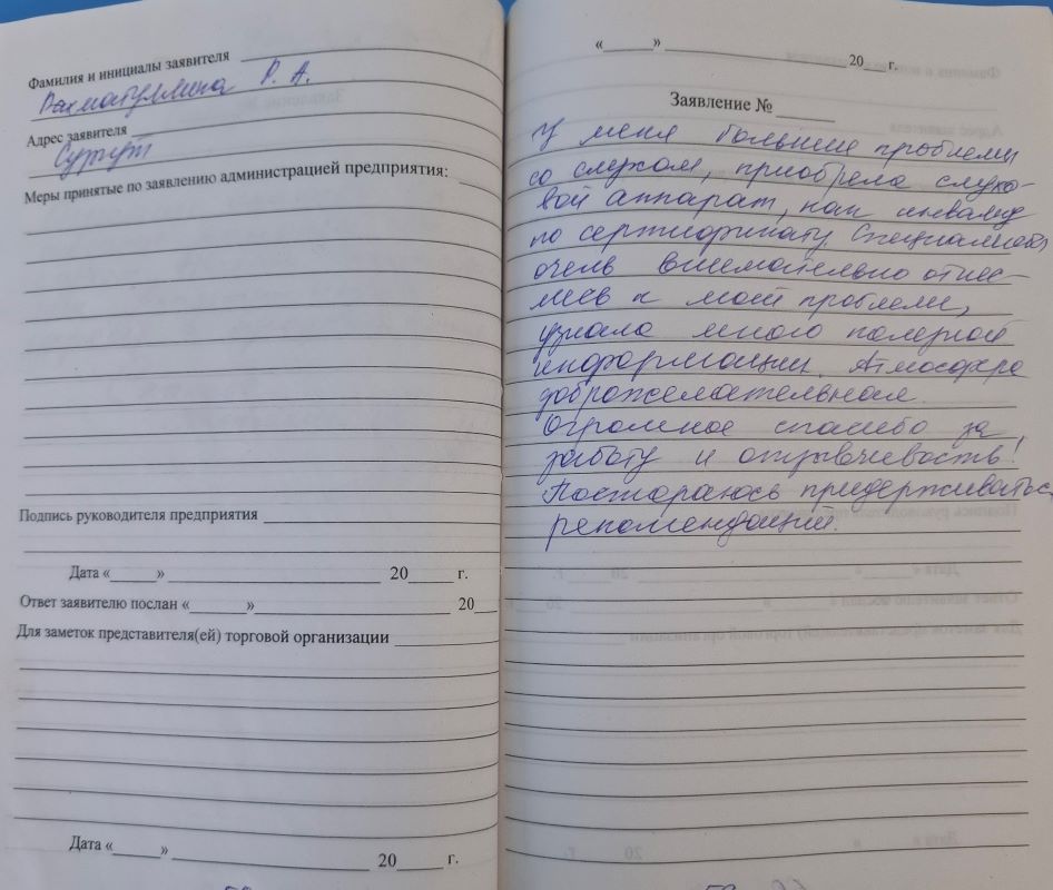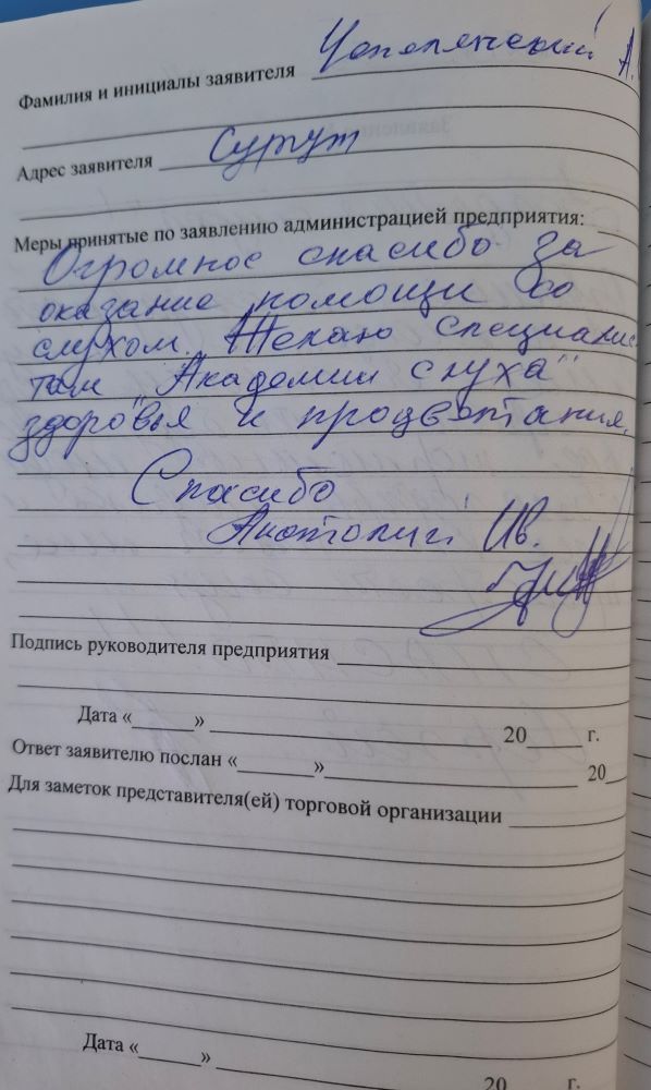 У меня большие проблемы со слухом, приобрела слуховой аппарат, как инвалид по сертификату. Специалисты очень внимательно отнеслись к моей проблеме, узнала много полезной информации. Атмосфера доброжелательная. Огромное спасибо за заботу и отзывчивость! Постараюсь придерживаться рекомендаций.