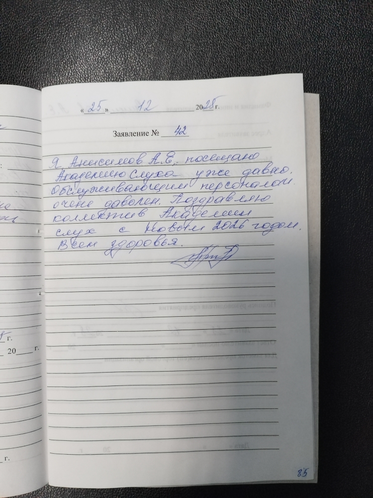 Я, Анисимов А.Е. посещаю Академию слуха уже давно. Обслуживающим персоналом очень доволен. Поздравляю коллектив Академии слуха с Новым 2026 годом. Всем здоровья!
