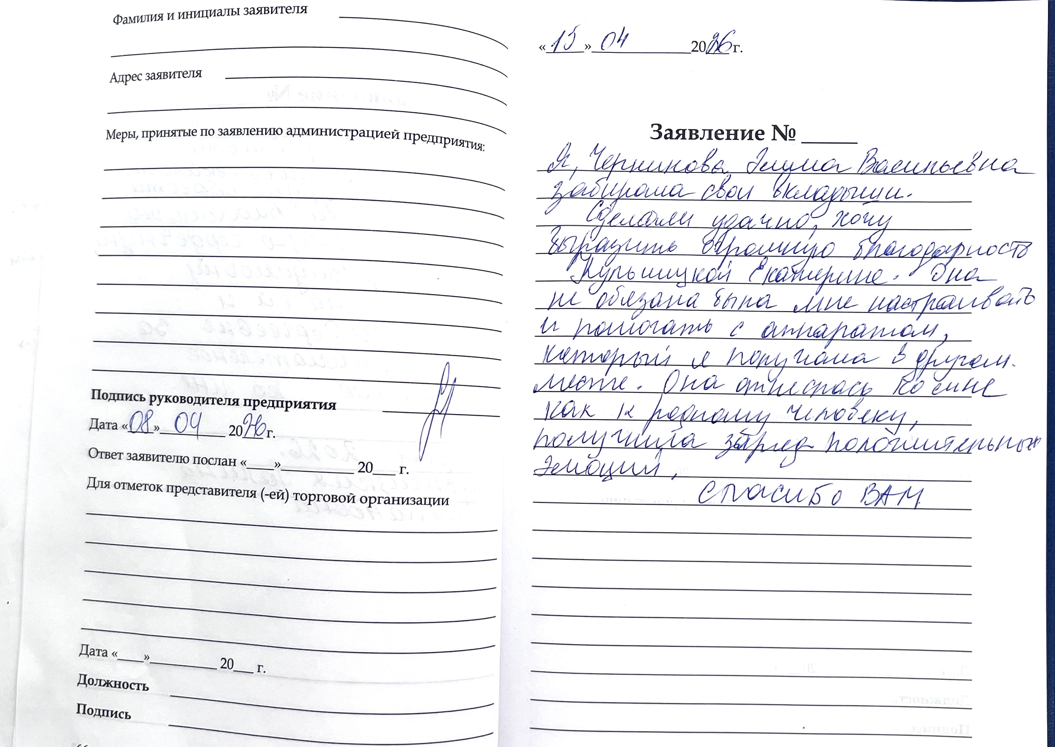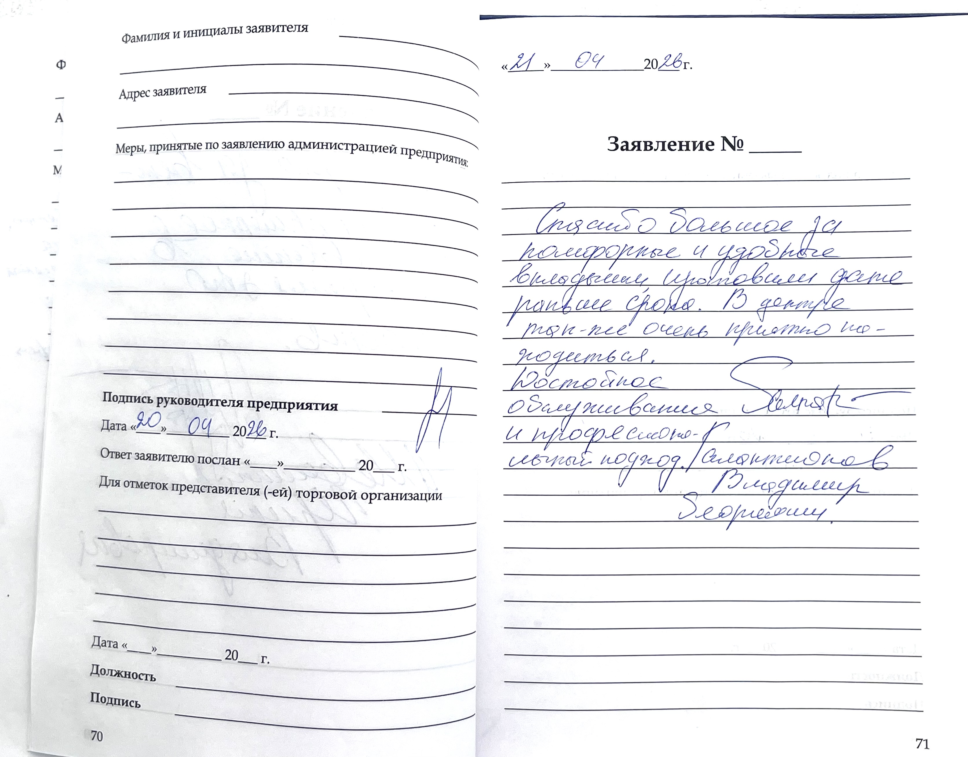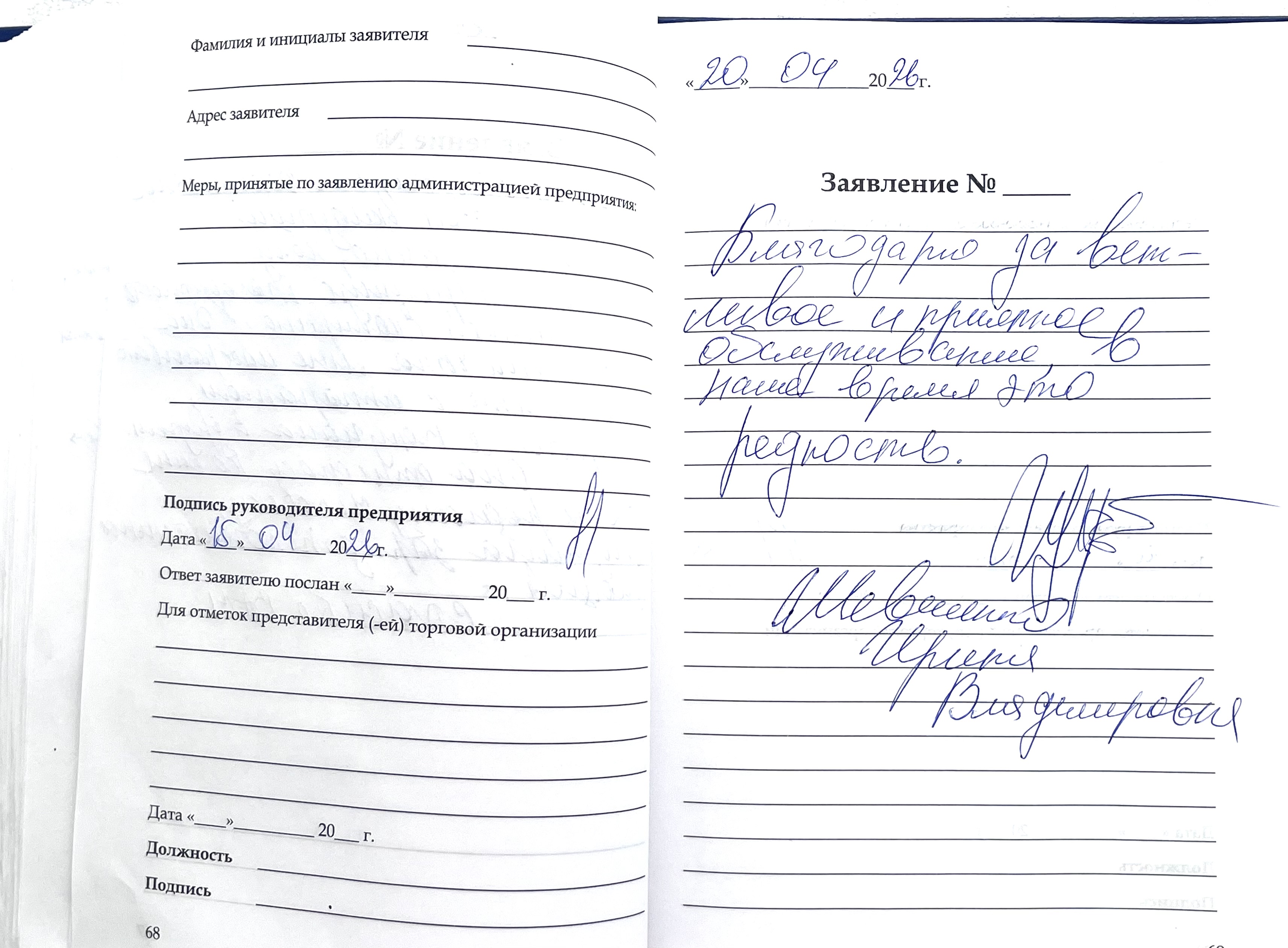 Благодарю за вежливое и приятное обслуживание, в наше время это редкость.