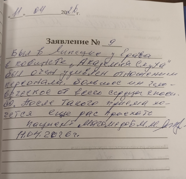 Был в Липецке у врача в кабинете " Академия слуха". Был очень удивлен отношением персонала , большое им человеческое, от всего сердца спасибо. После такого приема хочется ещё раз приехать.