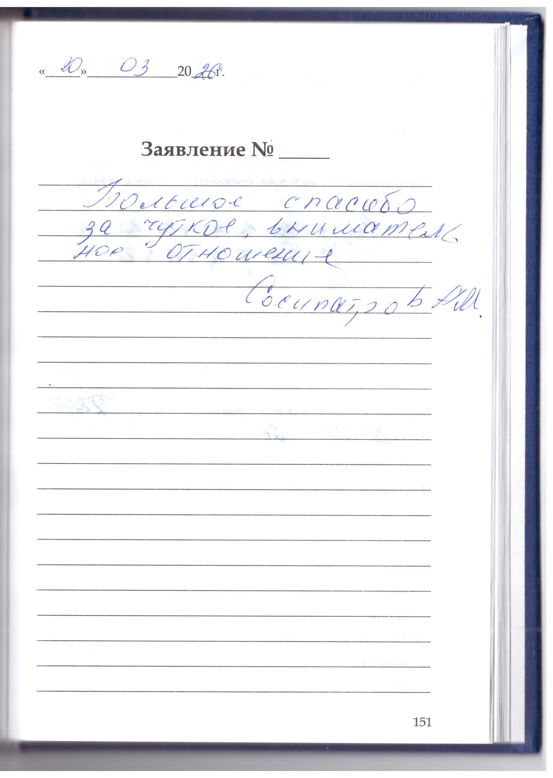 Большое спасибо за чуткое отношение,обслуживание и доброту.