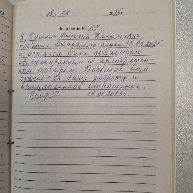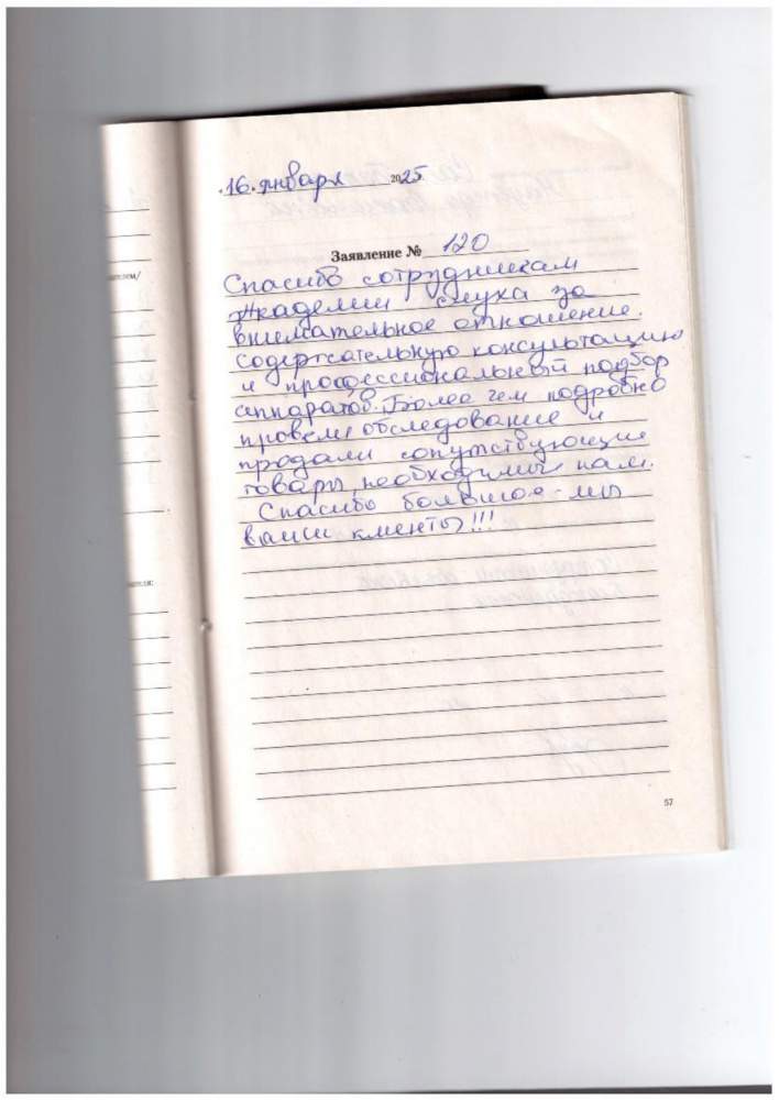 Спасибо сотрудникам Академии слуха за внимательное отношение.Содержательную консультацию и профессиональный подбор аппаратов.Более чем подробно провели обследование и продали сопутствующие товары, необходимые нам.Спасибо большое-мы ваши клиенты!!!