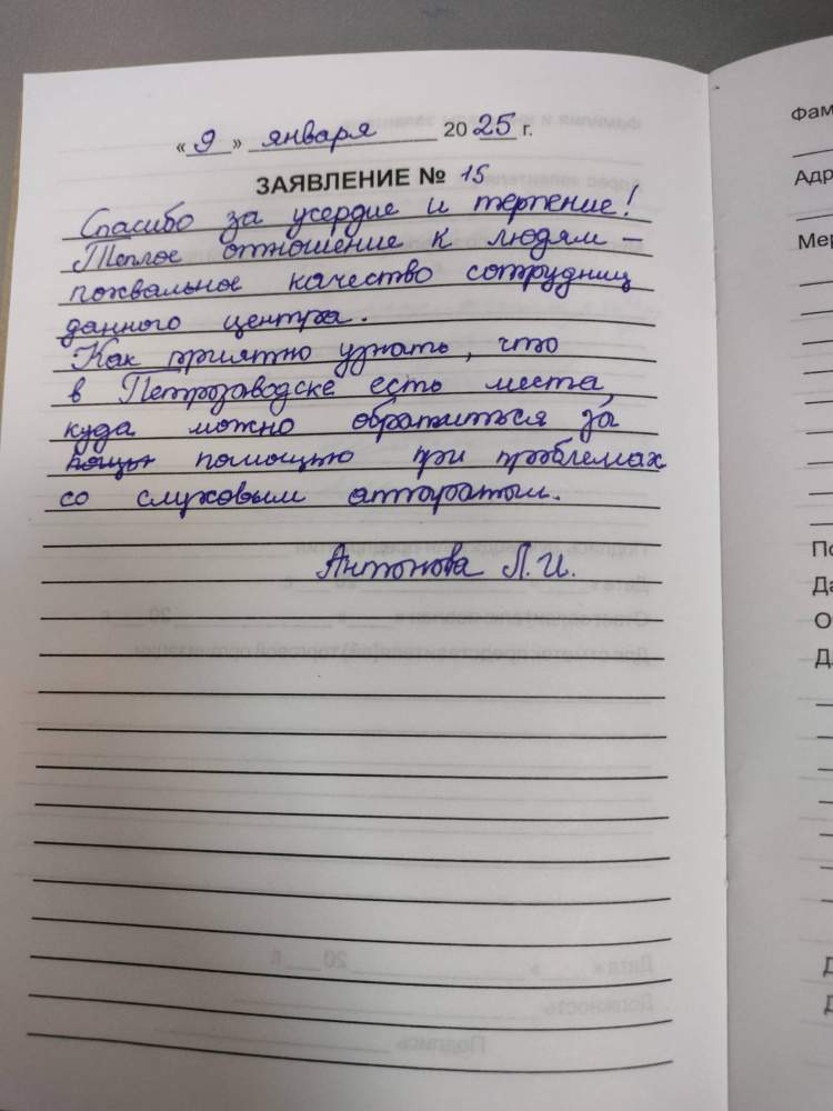Спасибо за усердие и терпение! Теплое отношение к людям – похвальное качество сотрудниц данного центра. Как приятно узнать, что в Петрозаводске есть места, куда можно обратиться за помощью при проблемах со слуховым аппаратом.