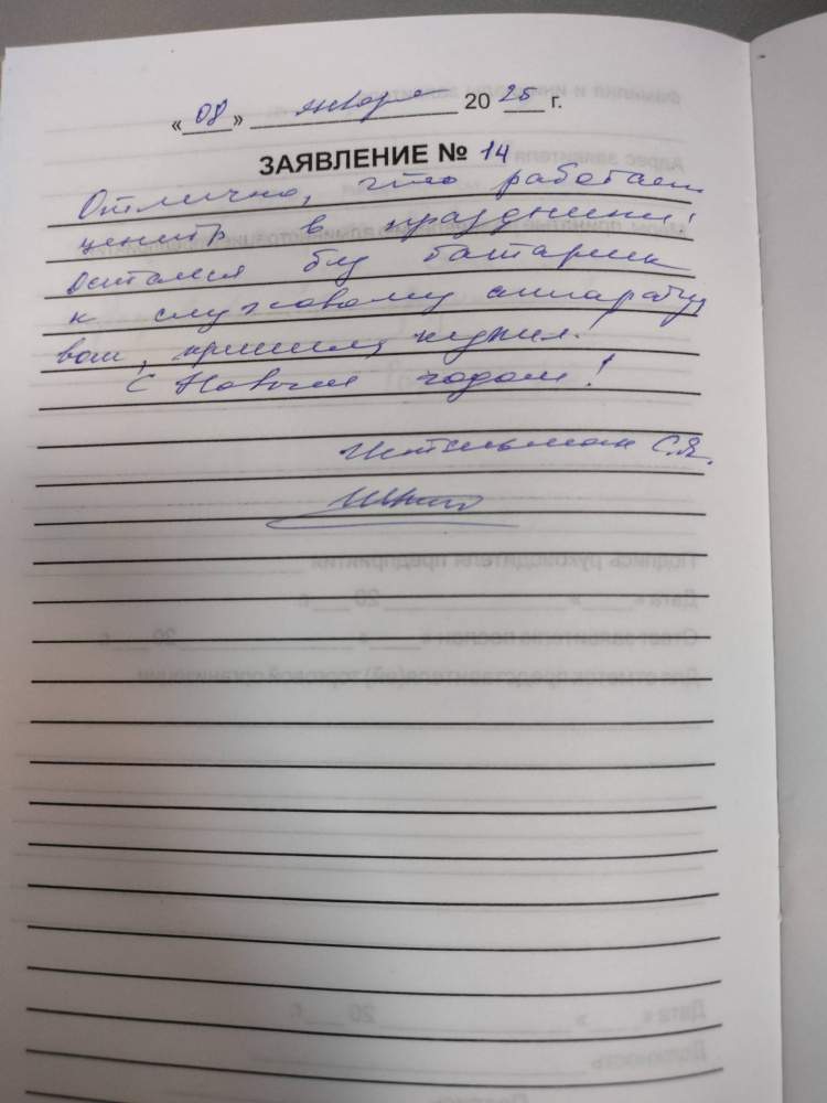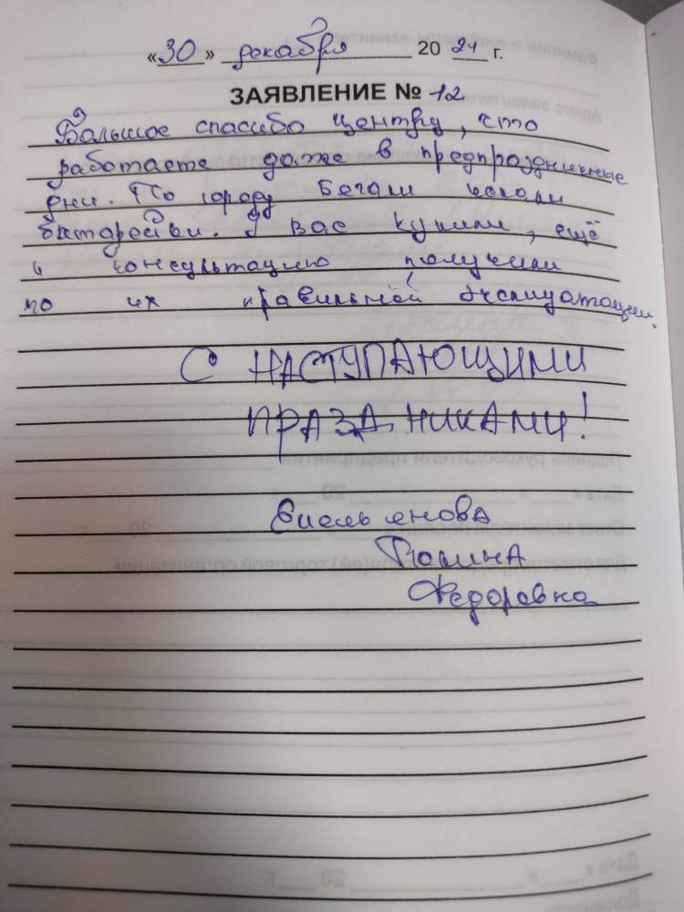 Большое спасибо центру, что работаете даже в предпраздничные дни. По городу бегали, искали батарейки. У вас купили, еще и консультацию получили по их правильной эксплуатации. С наступающими праздниками!