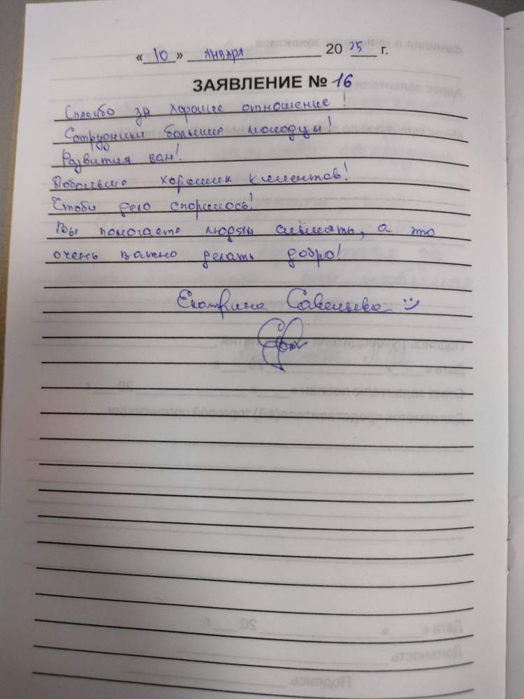 Спасибо, что поменяли мне трубочку в аппарате в выходной праздничный день. Очень меня порадовали. С праздниками!