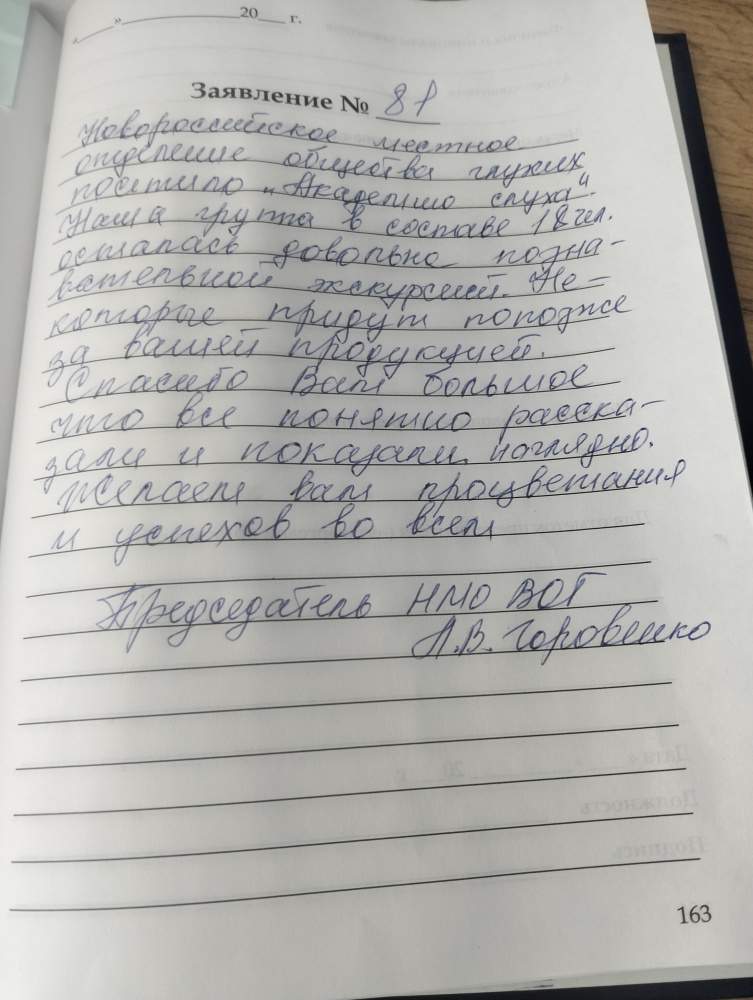 Новороссийское местное отделение общества глухих посетило " Академию Слуха" . Наша группа в составе 18 чел.осталась довольна познавательной экскурсией. Некоторые придут попозже за вашей продукцией.Спасибо Вам большое, что все понятно рассказали и показали наглядно. Желаем Вам процветания и успехов во всем. Председатель НМО ВОТ ЛВ. Горовенко