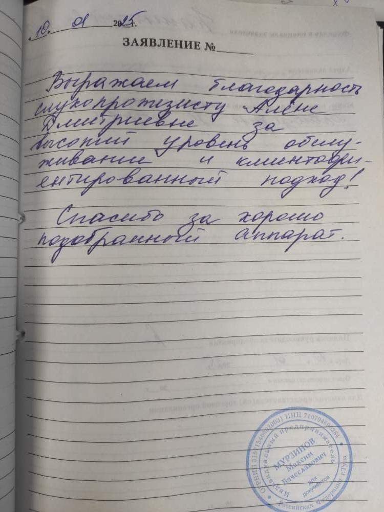 Выражаем благодарность слухопротезисту Алене Дмитриевне за высокий уровень обслуживания и клиентоориентированный подход! Спасибо за хорошо подобранный аппарат.