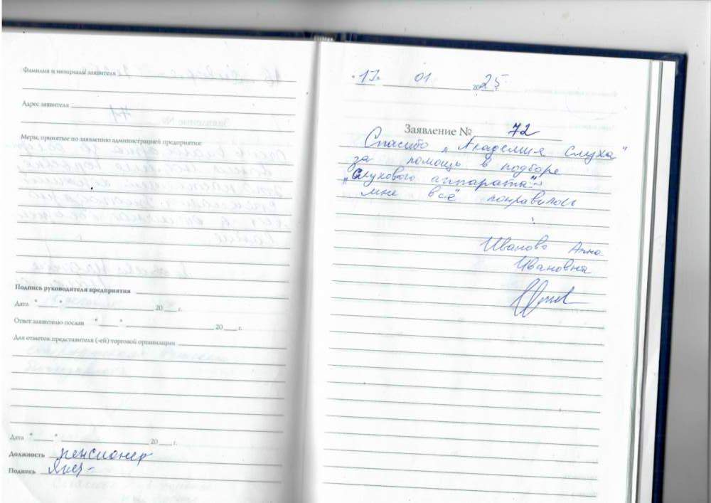 Я, Сабанова Любовь Федоровна, приобрела сегодня слуховой аппарат. Очень довольна обслуживанием, вежливо, приветливо. Желаю всем здоровья, счастья в наступающем году.