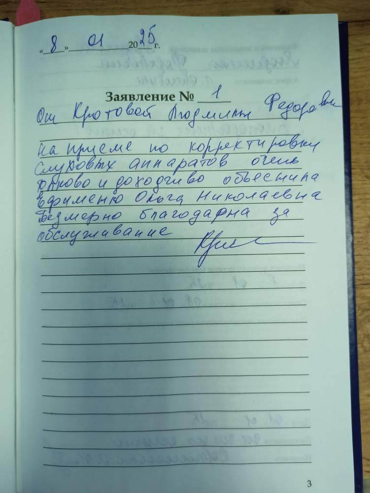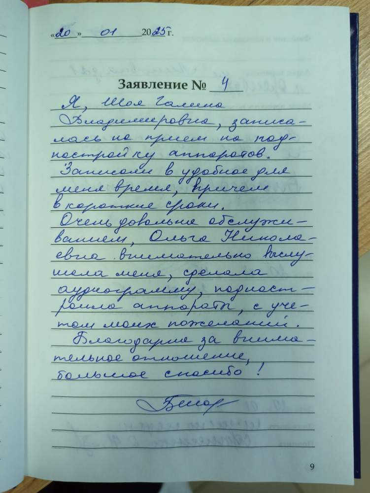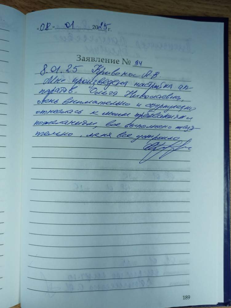 08.01.2025 Кривонос А.В. Мне произведена настройка аппаратов. Ольга Николаевна очень внимательно, скрупулёзно отнеслась к моим требованиям и пожеланиям, всё выполнено тщательно, меня всё устроило.