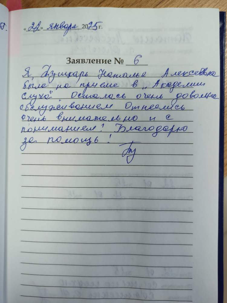 Я, Пушкарь Наталья Алексеевна, была на приёме в «Академии Слуха». Осталась очень довольна обслуживанием. Отнеслись очень внимательно и с пониманием! Благодарю за помощь!