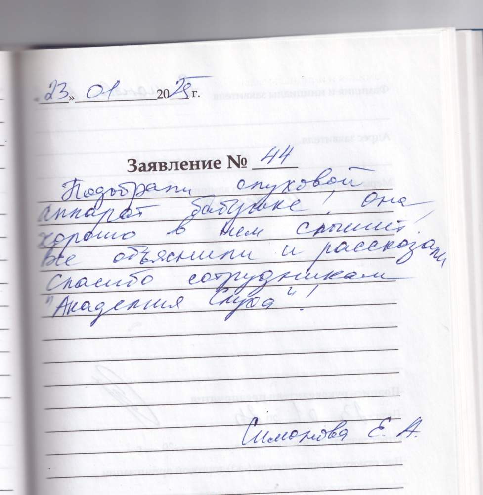 Я, Утешева Роза Дмитриева, хочу выразить благодарность Академии слуха за приятное чуткое отношение. Мне сделали слепок по бесплатной выдаче, все распросили, разъяснили, показали. Редко кто в наше время так обращается с людьми в организациях.