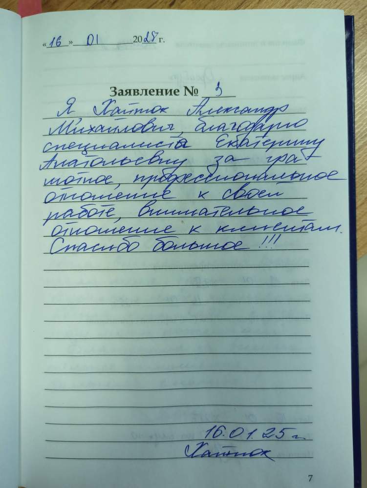Я, Хайтюк Александр Михайлович, благодарю специалиста Екатерину Анатольевну за грамотное , профессиональное отношение к своей работе , внимательное отношение к клиентам. Спасибо большое.