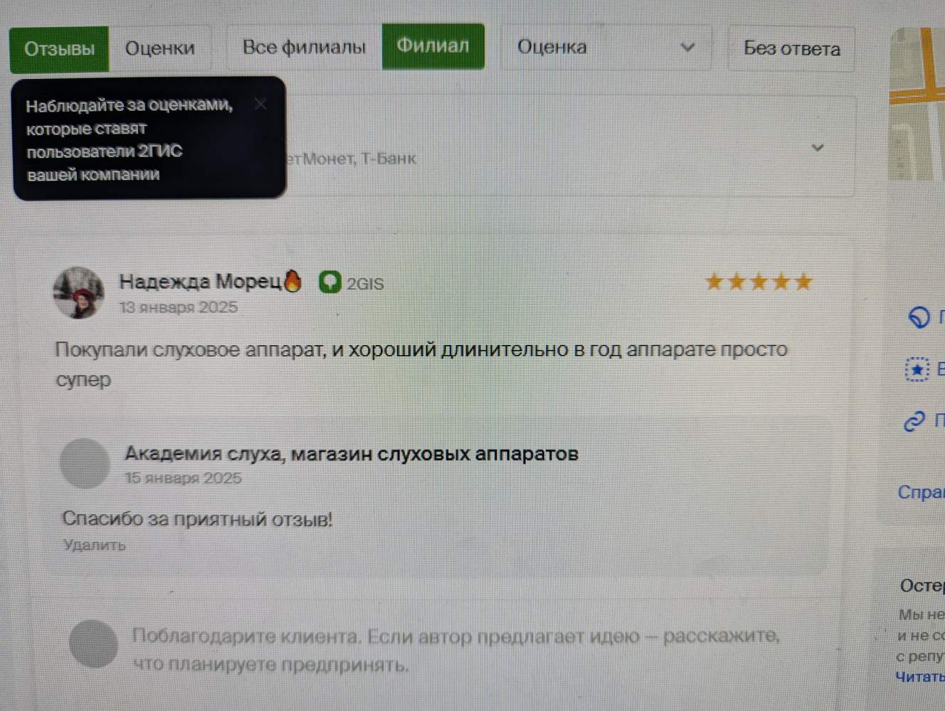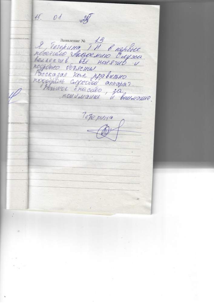 Я, Тетерина Т.Н в первые посетила Академию слуха. Коллектив все понятно и подробно объяснил. Рассказали как правильно подобрать слуховой аппарат.Большое спасибо ,за понимание и внимание.