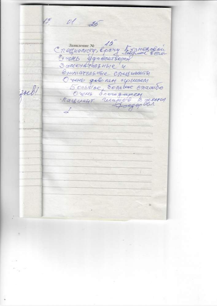 Специалисту, врачу Кузнецовой Людмиле Евгеньевне. Очень доволен. Замечательные и внимательные специалисты . Очень доволен приемом. Большое ,большое спасибо. Очень благодарен. Пациент Шаров В.Ф
