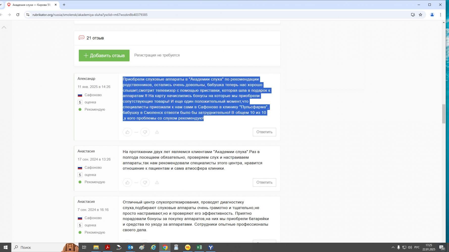 Приобрели слуховые аппараты в "Академии слуха" по рекомендации родственников, остались очень довольны, бабушка теперь нас хорошо слышит,смотрит телевизор с помощью приставки, которая шла в подарок к аппаратам !! На карту начислились бонусы на которые мы приобрели сопутствующие товары! И еще один положительный момент,что специалисты приезжали к нам сами в Сафоново в клинику "Пульсфарма", бабушку в Смоленск отвезти было бы затруднительно! В общем 10 из 10 ,у кого проблемы со слухом рекомендую!