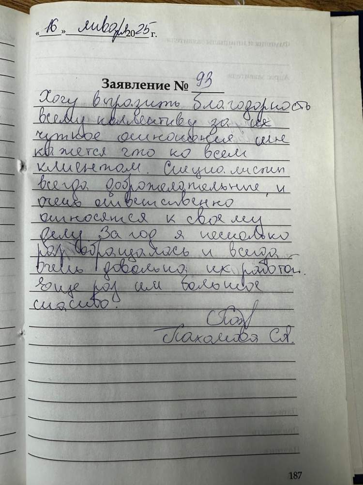 Хочу выразить благодарность всему коллективу за их чуткое отношение мне кажется что ко всем клиентам. Специалисты всегда доброжелательные, и очень ответственно относятся к своему делу. За год я несколько раз обращалась и всегда очень довольна их работой. Еще раз им большое спасибо.
