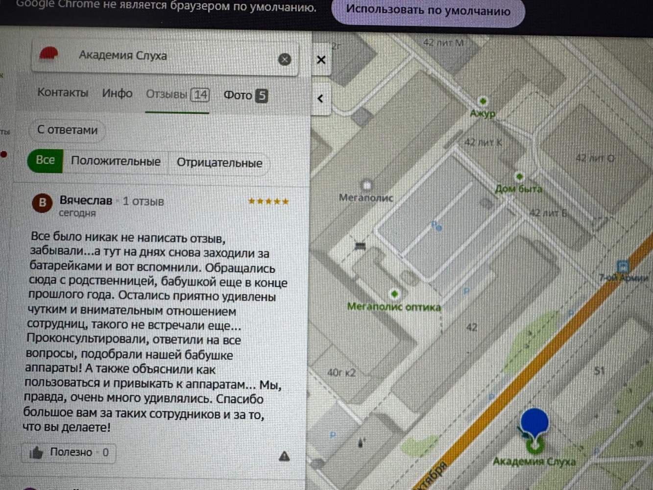 Все было никак не написать отзыв, забывали... а тут на днях снова заходили за батарейками и вот вспомнили. Обращались сюда с родственницей, бабушкой еще в конце прошлого года. Остались приятно удивлены чутким и внимательным отношением сотрудниц, такого не встречали еще...Проконсультировали, ответили на все вопросы, подобрали нашей бабушке аппараты! А также объяснили как пользоваться и привыкать к аппаратам...Мы, правда, очень много удивлялись. Спасибо большое вам за таких сотрудников и за то, что вы делаете!