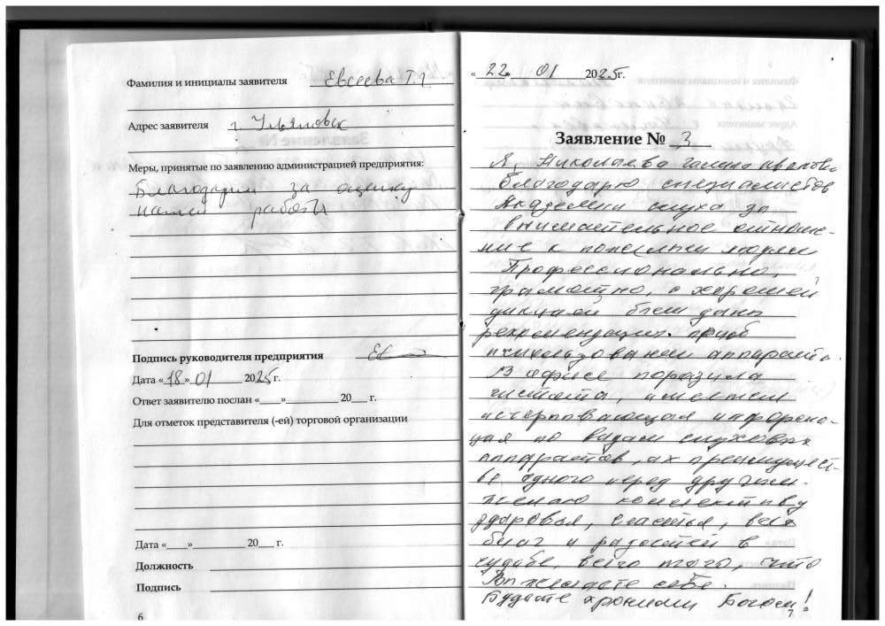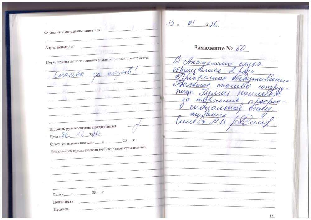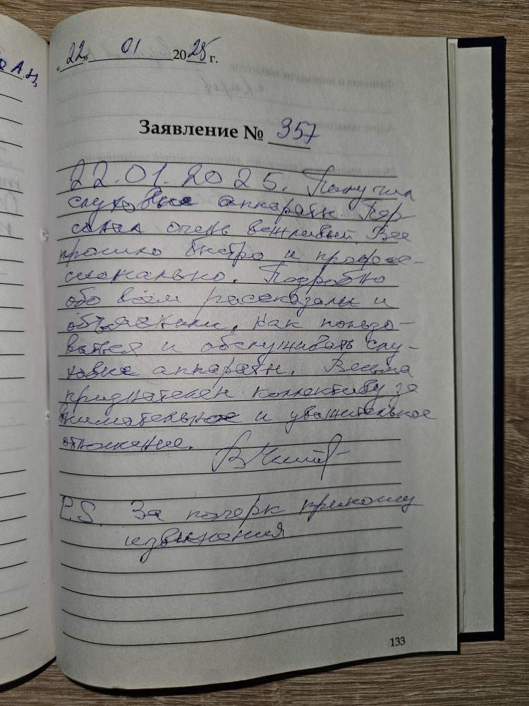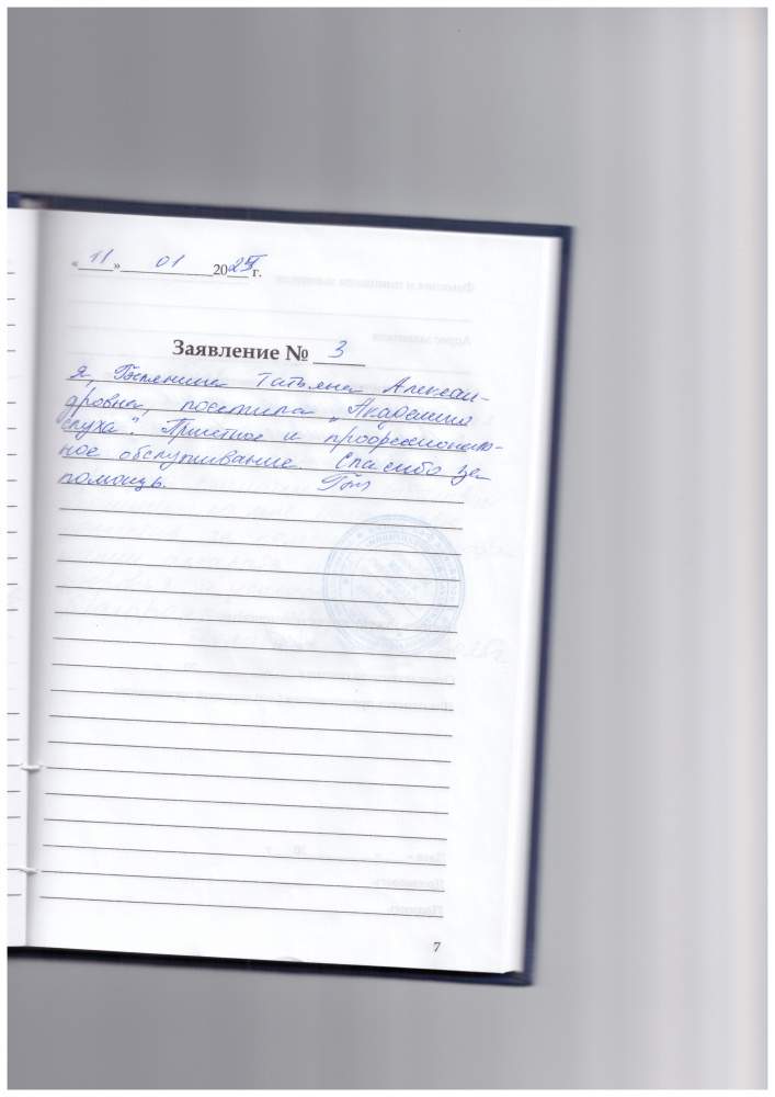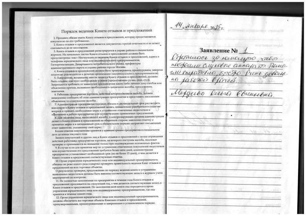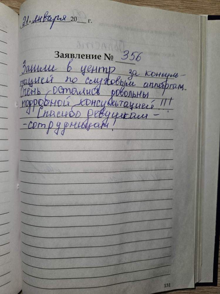 22.01.2025. Получил слуховые аппараты. Персонал очень вежливый. Все прошло быстро и профессионально. Подробно обо всём рассказали о объяснили, как пользоваться и обслуживать слуховые аппараты. Весьма признателен коллективу за внимательное и уважительное отношение. P.S. За почерк приношу извинения. Четвериков В.Н., г. Киров