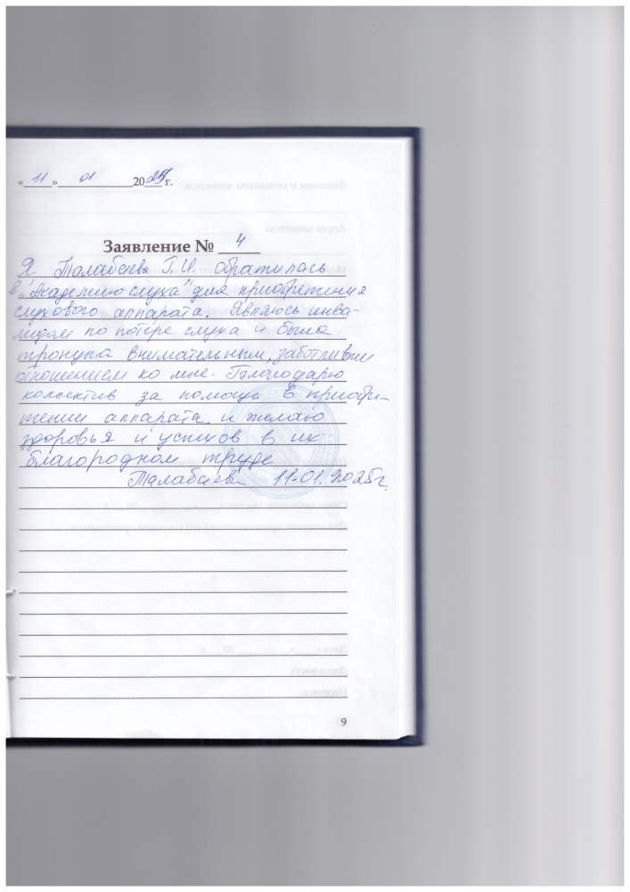 Я, Талабаева Г.И. обратилась в "Академию Слуха"для приобретения слухового аппарата. Явлюсь инвалидом по потере слуха и была тронута внимательным , заботливым отношением ко мне.Благодарю коллектив за помощь в приобретении аппарата и желаю здоровья и успехов в их благородном труде.