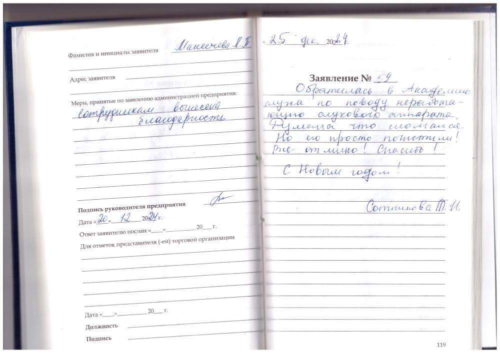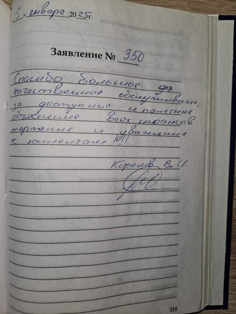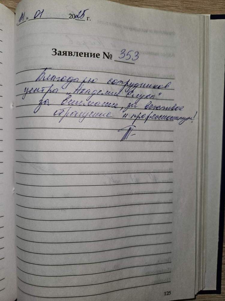 22.01.2025. Получил слуховые аппараты. Персонал очень вежливый. Все прошло быстро и профессионально. Подробно обо всём рассказали о объяснили, как пользоваться и обслуживать слуховые аппараты. Весьма признателен коллективу за внимательное и уважительное отношение. P.S. За почерк приношу извинения. Четвериков В.Н., г. Киров