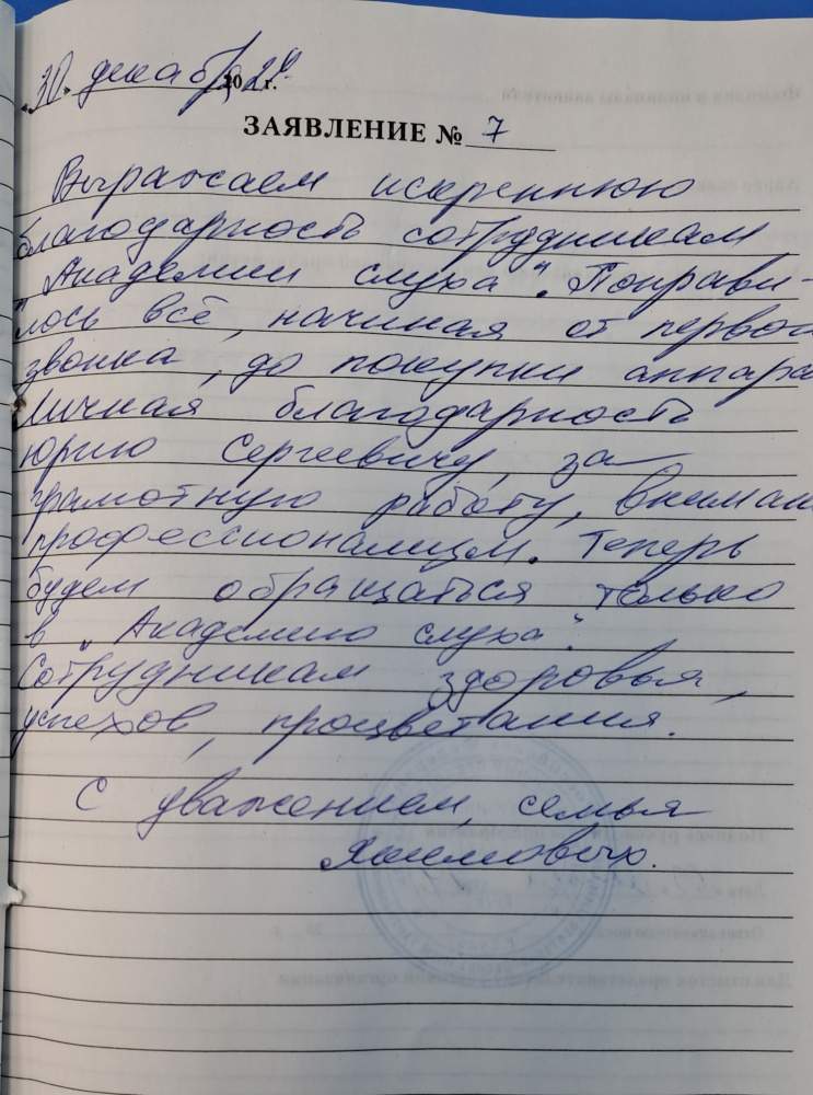 Выражаем искреннюю благодарность сотрудникам Академия слуха. Понравилось все, начиная от первого звонка до покупки аппарата. Личная благодарность Юрию Сергеевичу за грамотную работу, внимание, профессионализм. Теперь будем обращаться только в Академию слуха. Сотрудникам здоровья, успехов, процветания. С уважением, семья Якимовых.