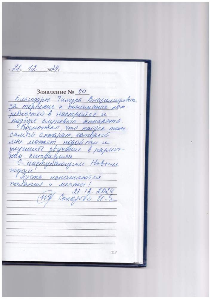 Благодарю Тимура Викторовича за терпение и понимание потребностей в настройке и подборе слухового аппарата. Возможно, что найден тот самый аппарат, который мне поможет подойти и улучшить звучание в различных ситуациях.