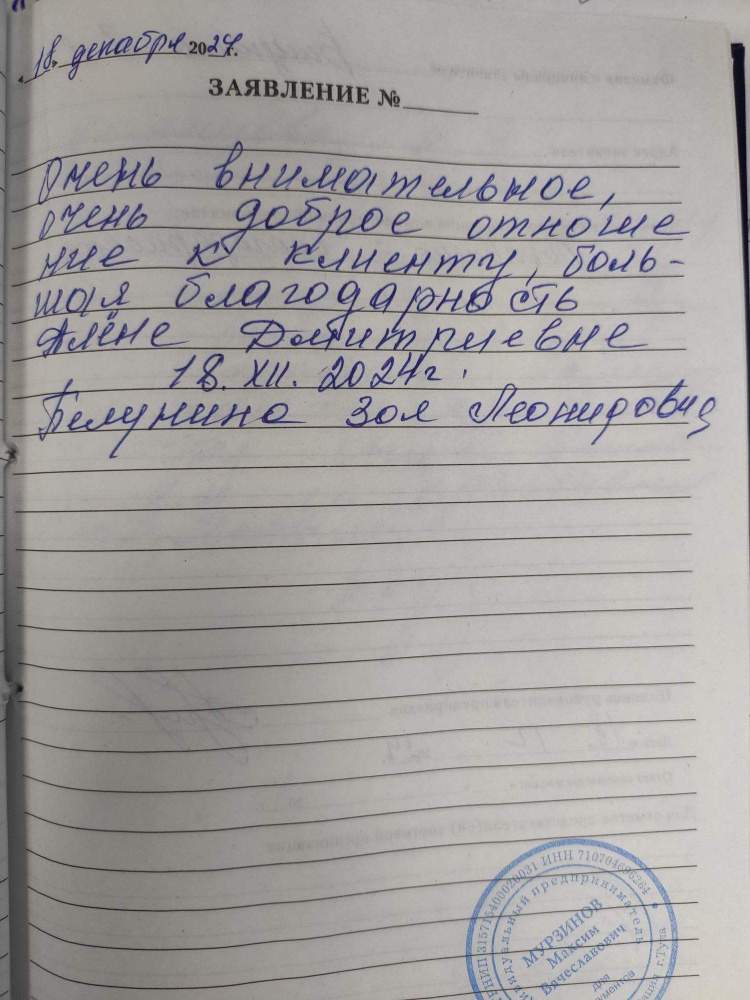 Очень внимательное , очень доброе отношение к клиенту, большая благодарность Алене Дмитриевне.