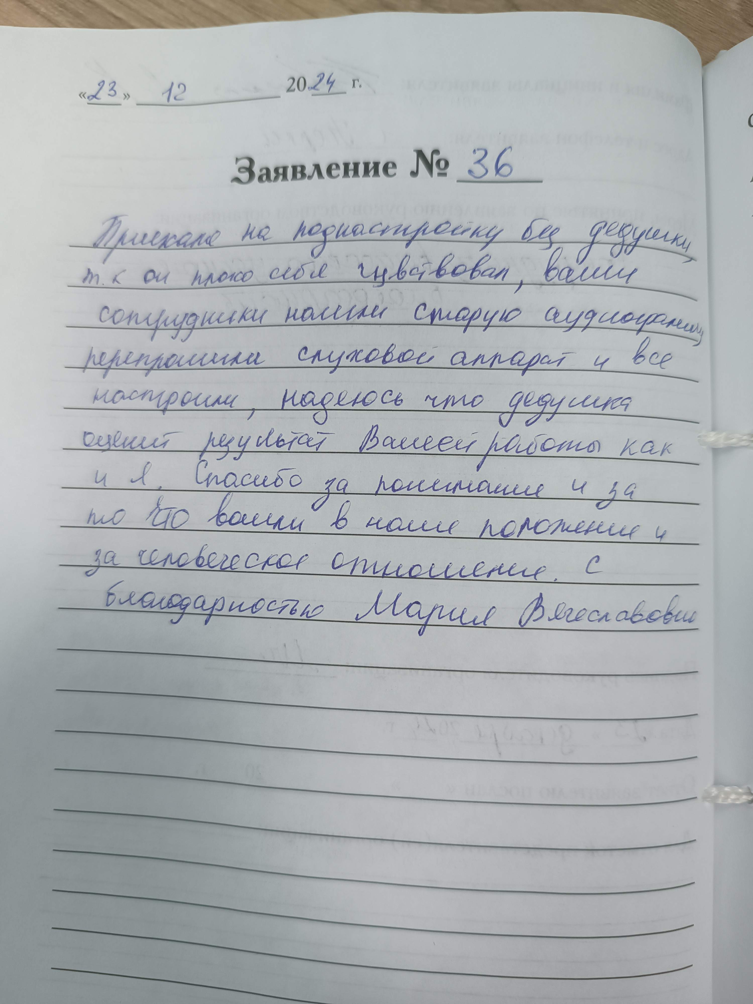 Приехала на поднастройку без дедушки, т.к он плохо себя чувствовал, ваши сотрудники нашли старую аудиограмму перепрошили слуховой аппарат и всё настроили, надеюсь что дедушка оценит результат Вашей работы как и я. Спасибо за понимание и за то что вошли в наше положение и за человеческое отношение. С благодарностью Мария Вячеславовна