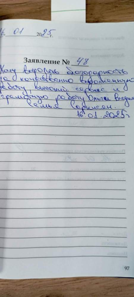 Хочу выразить благодарность за качественно выполненную работу, высокий сервис и грамотную работу Ольги Владимировны.