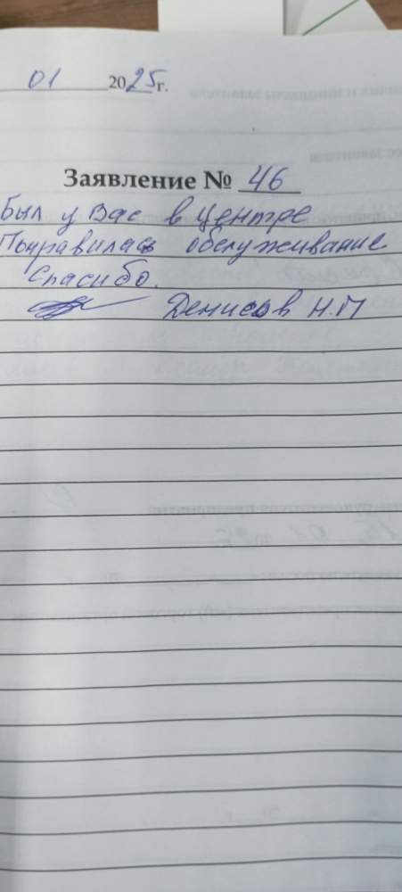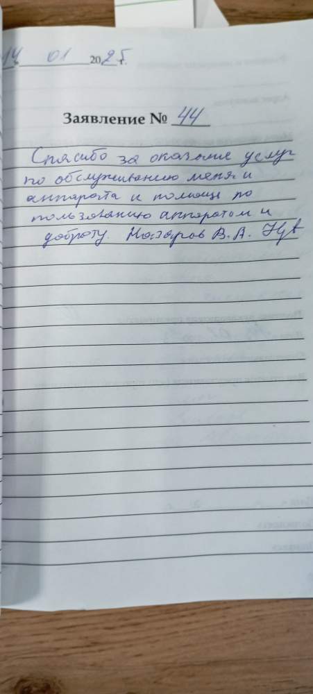 Спасибо за оказание услуг по обслуживанию меня и аппарата и помощь по пользованию аппаратом и доброту.