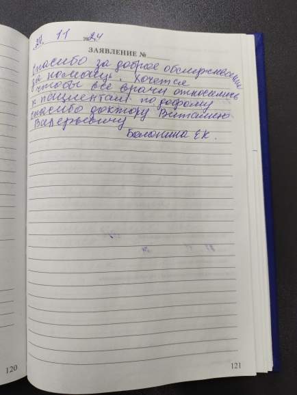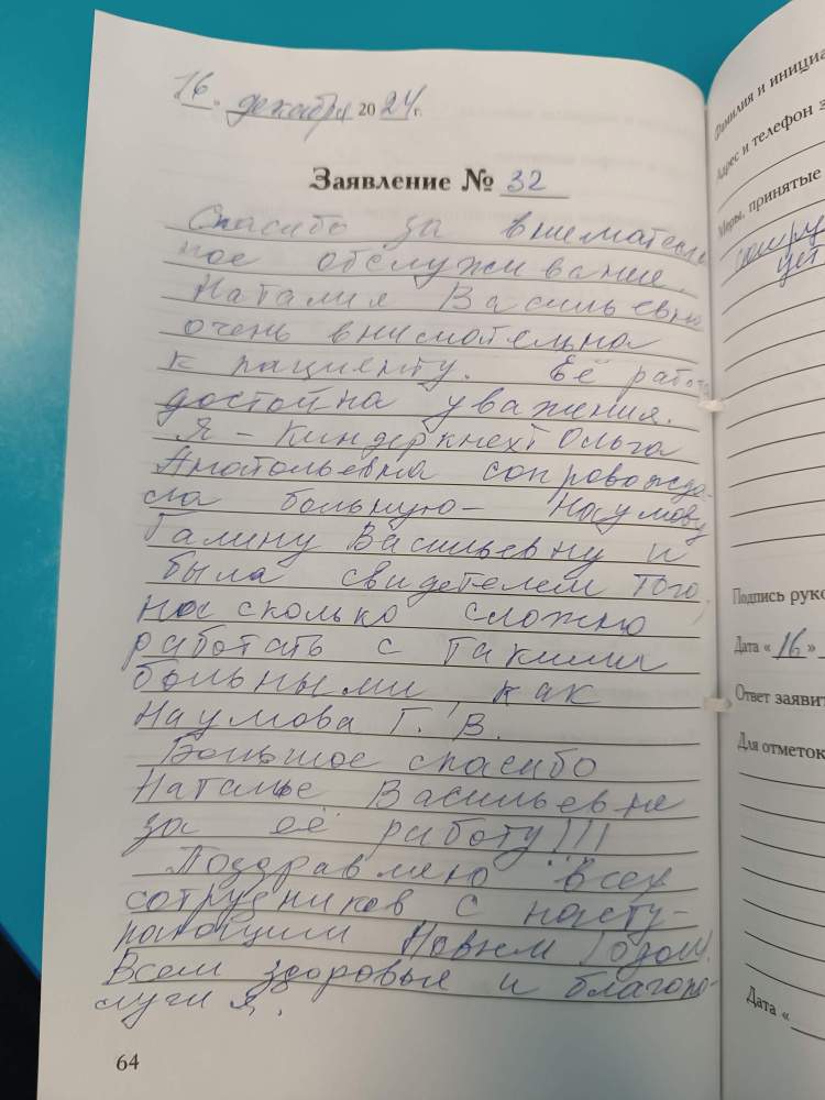 Спасибо за внимательное обслуживание. Наталья Васильевна очень внимательна к пациенту. Её работа достойна уважения. Я Киндеркнехт Ольга Анатольевна сопровождала больную-Наумову Галину Васильевну и была свидетелем того, на сколько сложно работать с такими больными, как Наумова Г.В. Большое спасибо Наталье Васильевне за её работу!!! Поздравляю всех сотрудников с наступающим Новым Годом. Всем здоровья и благополучия.