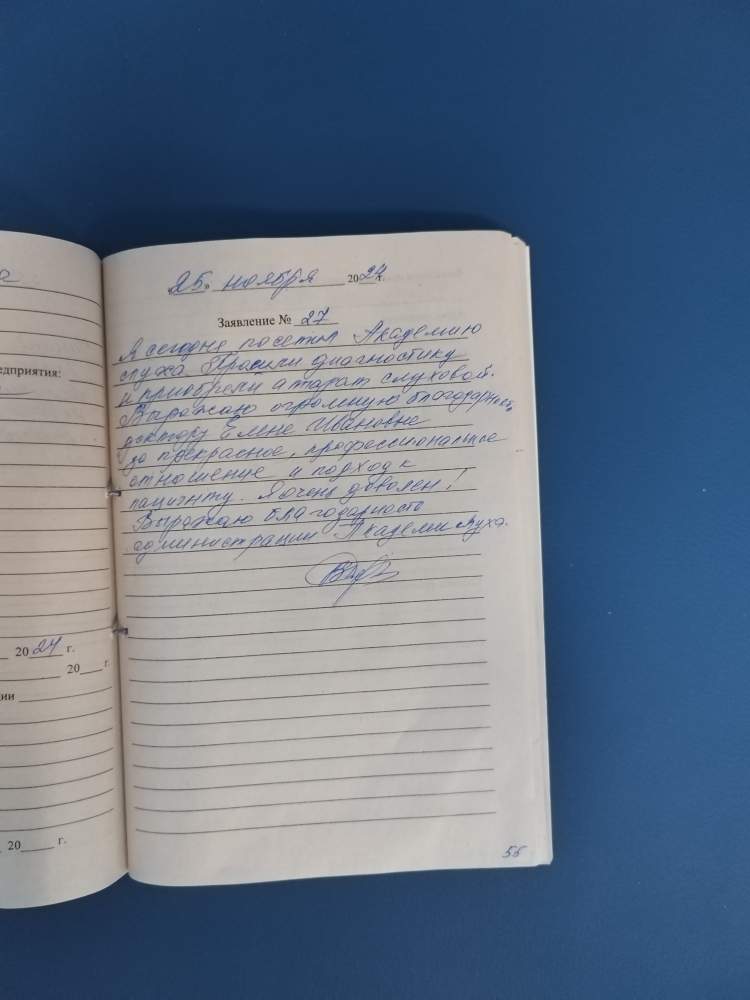 Я сегодня посетил Академию слуха. Просили диагностику и приобрели слуховой аппарат. Выражаю огромную благодарность доктору Елене Ивановне за прекрасное, профессиональное отношение и подход к пациенту. Я очень доволен! Выражаю благодарность администрации академии слуха.