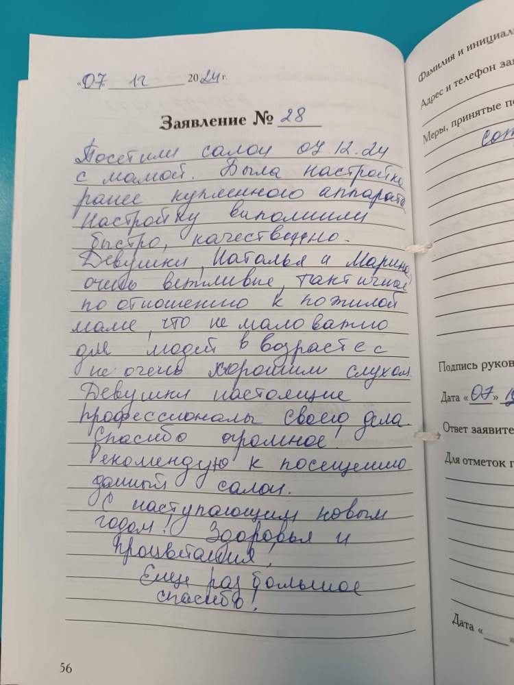 Посетили салон 07.12.24 с мамой. Была настройка ранее купленного аппарата. Настройку выполнили быстро, качественно. Девушки, Наталья и Марина, очень внимательные, тактичные по отношению к пожилой маме, что не мало важно для людей в возрасте с не очень хорошим слухом. Девушки настоящие профессионалы своего дела. Спасибо огромное. Рекомендую к посещению данный салон. С наступающим новым годом! Здоровья и процветания. Еще раз большое спасибо!