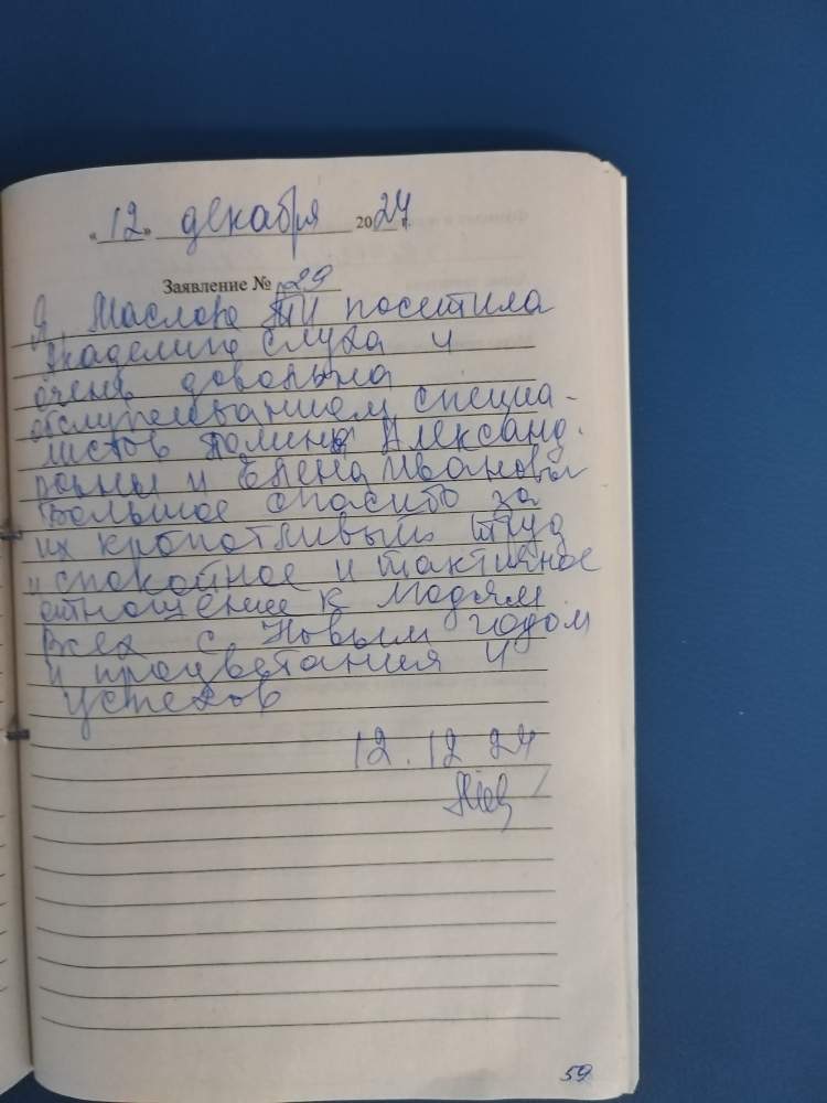 Я, Маслова Т.И. поселила Академию слуха и очень довольна обслуживанием специалистов Полины Александровны и Елены Ивановны. Большое спасибо за их кропотливый труд и спокойное и тактичное отношение к людям. Всех с Новым годом и процветания, и успехов.