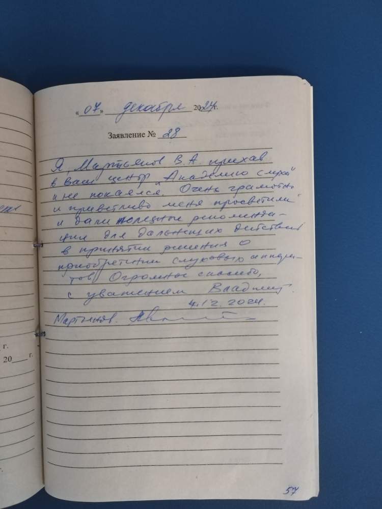 Я, Мартьянов В.А. приехал в ваш центр "Академию слуха" и не покаялся. Очень грамотно и приветливо меня просветили и дали полезные рекомендации для дальнейших действий в принятии решений о приобретении слуховых аппаратов. Огромное спасибо, с уважением Владимир.