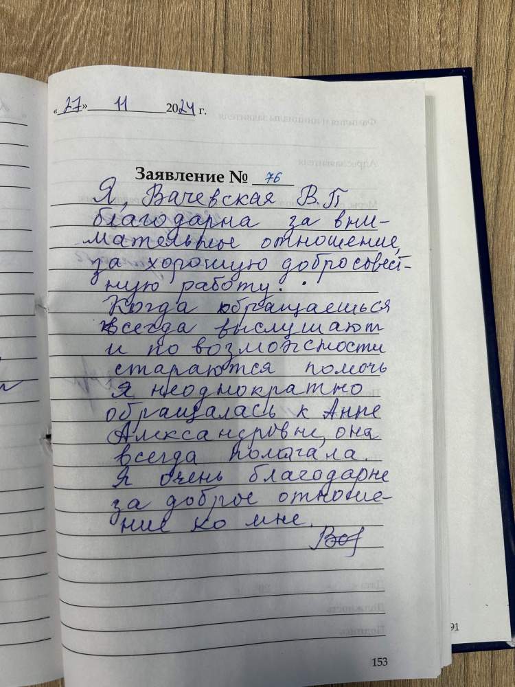 Я, Вачевская В.П. благодарна за внимательное отношение, за хорошую добросовестную работу. Когда обращаешься всегда выслушают и по возможности стараются помочь. Я не однократно обращалась к Анне Александровне, она всегда помогала. Я очень благодарна за доброе отношение ко мне.