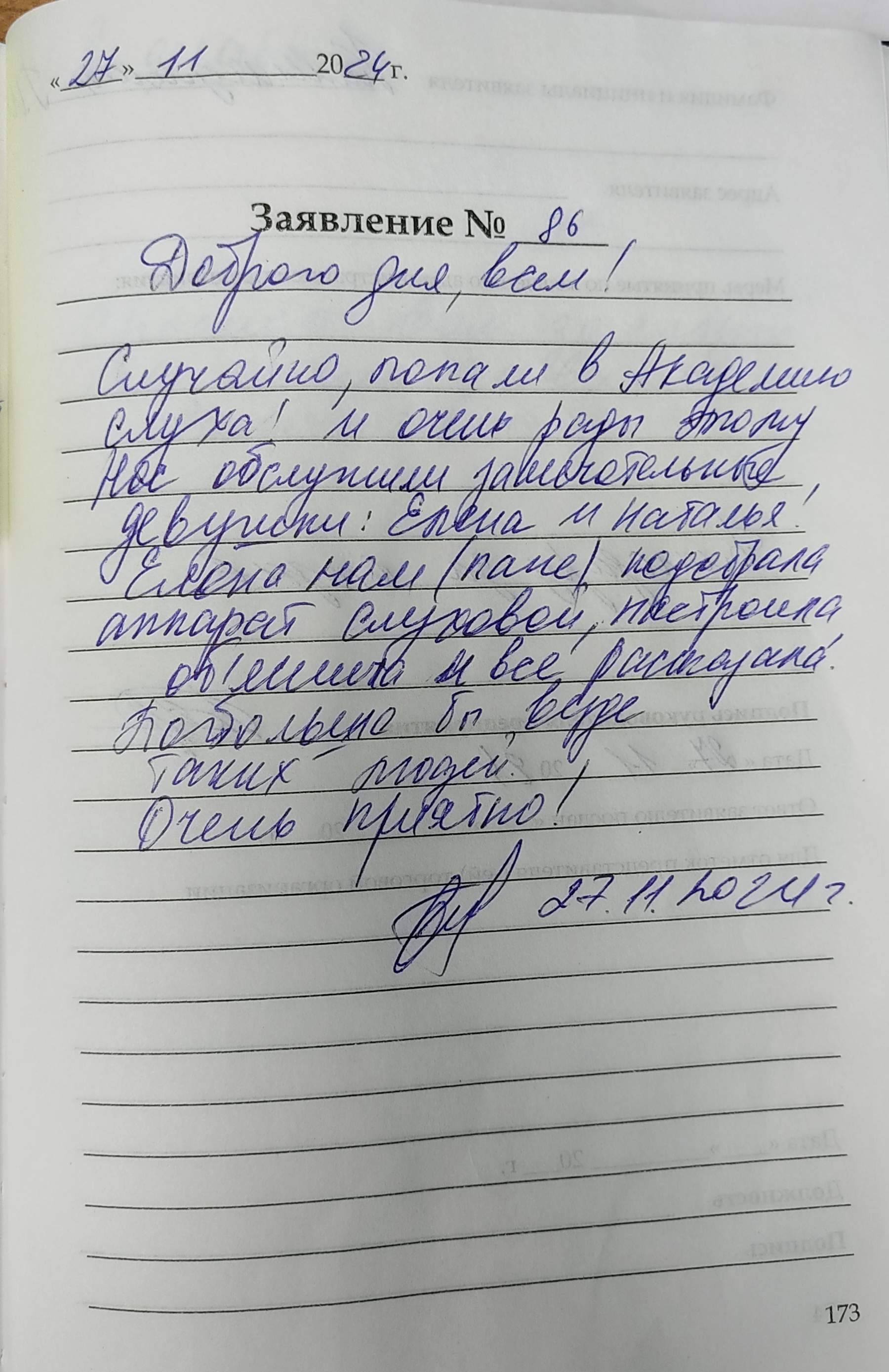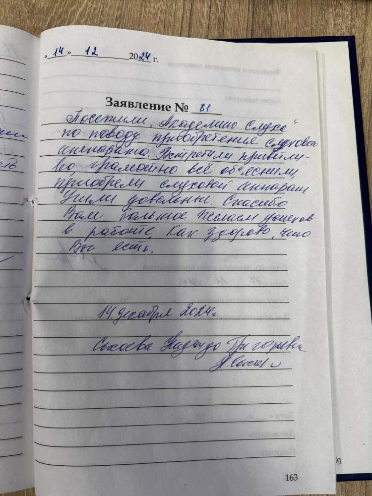 Посетили «Академия Слуха» по поводу приобретения слухового аппарата. Встретили приветливо, грамотно все объяснили, приобрели слуховой аппарат. Ушли довольные. Спасибо Вам большое. Желаем успехов в работе. Как здорово, что Вы есть. Сысоева Надежда Григорьевна 14 декабря 2024
