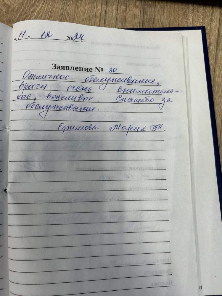 Отличное обслуживание, врачи очень внимательные, вежливые. Спасибо, за обслуживание. Ефимова Мария
