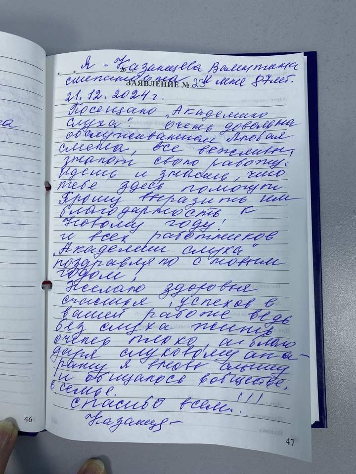 Посещаю "Академию Слуха". Очень довольна обслуживанием. Любая смена, все вежливы, знают свою работу. Идешь и знаешь, что тебе здесь помогут. Прошу выразить им благодарность к Новому году! И всех работников "Академии слуха" поздравляю с Новым годом! Желаю здоровья счастья, успехов в вашей работе ведь без слуха жить очень плохо, а благодаря слуховому аппарату я вновь слышу и общаюсь в обществе, в семье. Спасибо всем!!! Казакова ВС 87лет