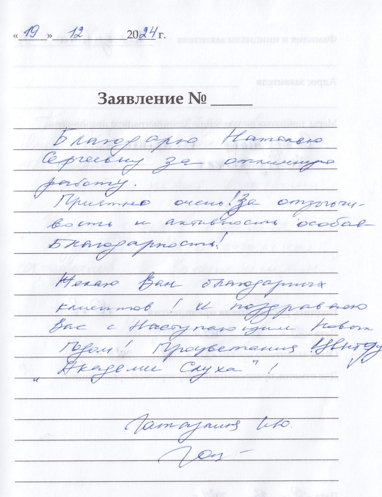 Благодарю Наталью Сергеевну за отличную работу. Приятно очень! За отзывчивость и активность особая благодарность! Желаю Вам благодарных клиентов и поздравляю Вас с наступающим Новым Годом! Процветания Центру «Академия слуха»!